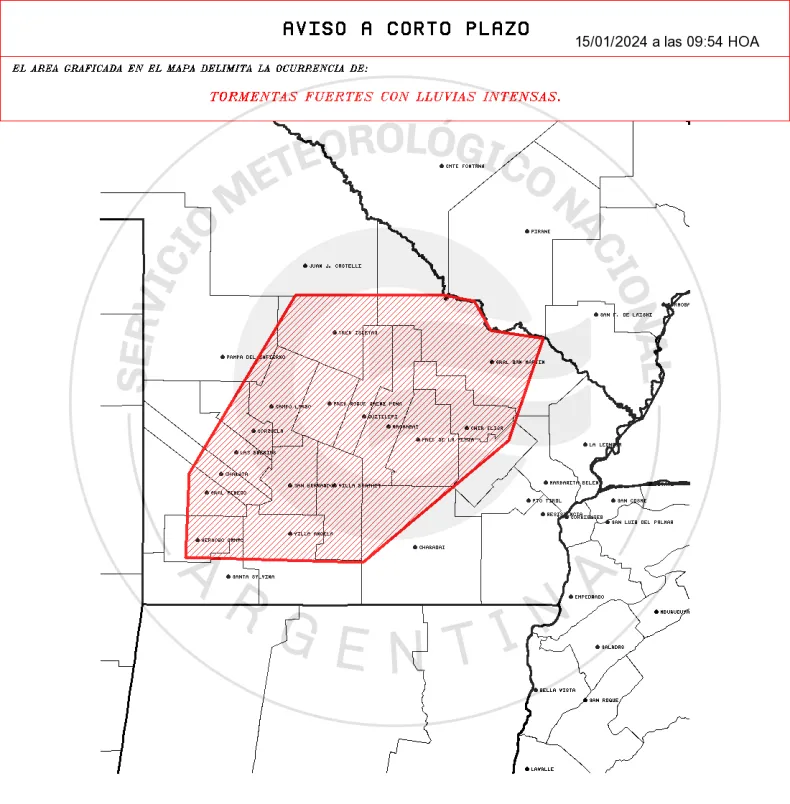 Por otro lado, desde el Servicio Meteorológico Nacional emitieron un aviso a corto plazo, por tormentas fuertes con lluvias intensas.