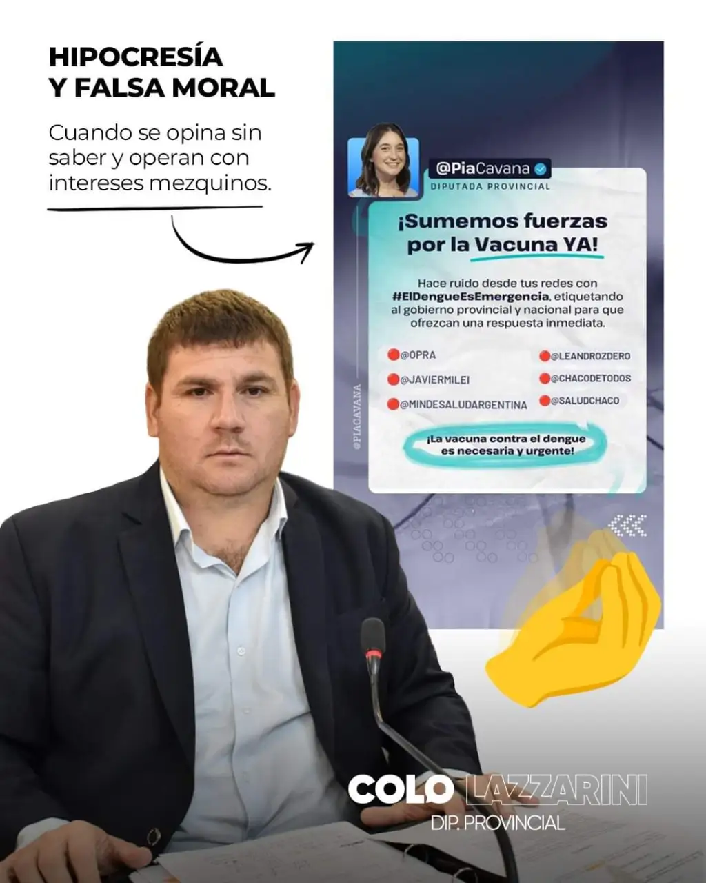 En una misiva el Diputado provincial de Juntos por el Cambio del Departamento Guemes , presidente del interbloque de JxC Dr Sebastian Lazzarini acuso de hipocrita y de Falsa Moral a la ex ministra de Desarrollo Social de la Provincia del Chaco del gobierno de Capitanich, actual Diputada Provincial, María Pía Chiacchio Cavana, la misma dice: