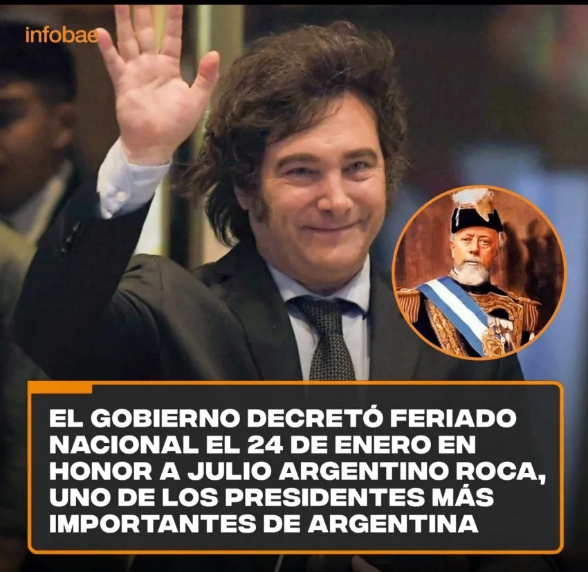 En las últimas horas se viralizó una placa de un medio de noticias nacional, el cual indicaba que dentro de 20 días, el gobierno de Javier Milei había anunciado una nueva jornada no laborable. Sin embargo, no es verdad.En las últimas horas, los usuarios de WhatsApp se vieron sorprendidos ante una supuesta placa del medio de comunicación infobae, el cual indicaba que el próximo 24 de enero, (día en que la CGT convocó a un paro nacional), el gobierno de Javier Milei decretaba un feriado, en honor a Julio Argentino Roca.