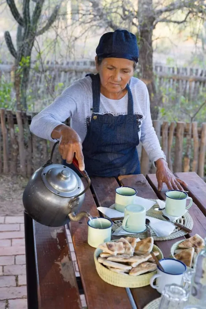 Olga Palavecino y su hija Nilda viven a un kilómetro del camping “Los Algarrobos”, donde tienen el taller de tintes naturales ‘el Pacará’. Allí reciben visitas y enseñan a obtener tinturas con fibras vegetales con materia prima proveniente del monte, para el teñido de prendas tejidas con lana de oveja.La experiencia comienza con una excursión cerca de su casa, por el monte, donde se extraen diferentes cortezas y fibras que posteriormente se utilizan para el teñido. La excursión termina después de haber teñido con las técnicas compartidas, y sirven una espectacular merienda con platos típicos y tradicionales, como masas dulces realizadas con harina de algarroba, ucle y miel del monte. El ucle es un fruto de monte que provee un cactus de la zona, se prepara artesanalmente para ser servido como crema helada, mermelada o budín.