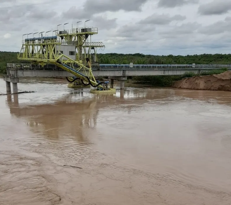 En la zona de El Pintado, operarios de Sameep realizan trabajos para reforzar el terraplén y evitar que la corriente del río impacte directo contra el cuenco y pontón flotante de la toma principal de agua. En el lugar hay muchas complicaciones con los caminos cortados que imposibilitan a los operarios llegar al sitio.