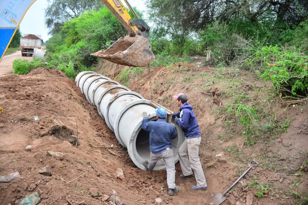 En el lugar, el personal municipal trabaja en la colocación de tubos de alcantarilla en uno de los canales de desagüe de la ciudad, lo que permitirá optimizar el escurrimiento del agua y facilitar futuras obras viales.