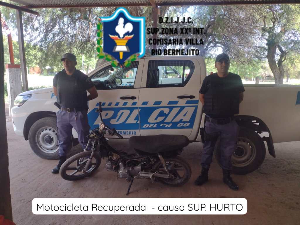 Hora referida, tras arduo trabajo realizado por partes personal está Cria. *SE LOGRÓ EL SECUESTRO DEL RODADO DENUNCIADO COMO SUSTRAÍDO*, previo tomar conocimiento que la misma sería traslada de esta Loc. para ser comercializada en la ciudad de J.J. Castelli, Alertado por la información recabada, la instrucción realizó Amplio rastrillaje por caminos alternativo y tras realizar patrullaje por camino vecinal del Barrio CTI se logró hallar la motocicleta, la cual fue abandonada a la vera del camino. Se procedió al secuestro del Rodado.